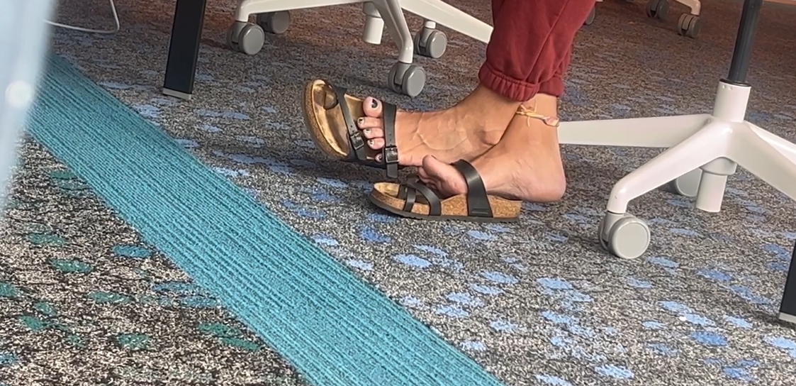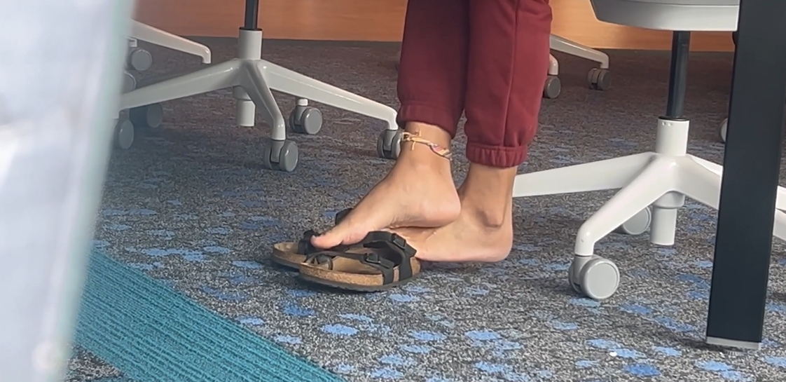 This latina lady at the library constantly and carelessly takes off her birks and plays with them. This video has dipping, cross ankle and dangling. You can tell the birkenstocks are worn down