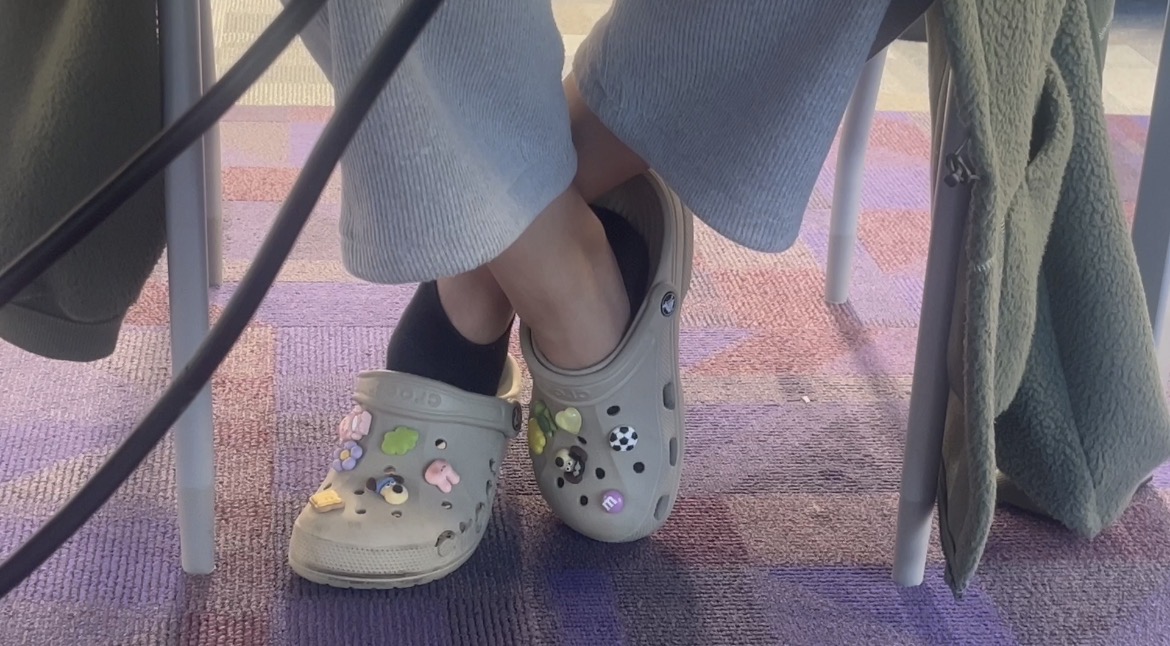 This asian girl was studying in the library and I noticed her out of her crocs in peds socks. She does cross ankle dipping, slight dangling and even takes them off.